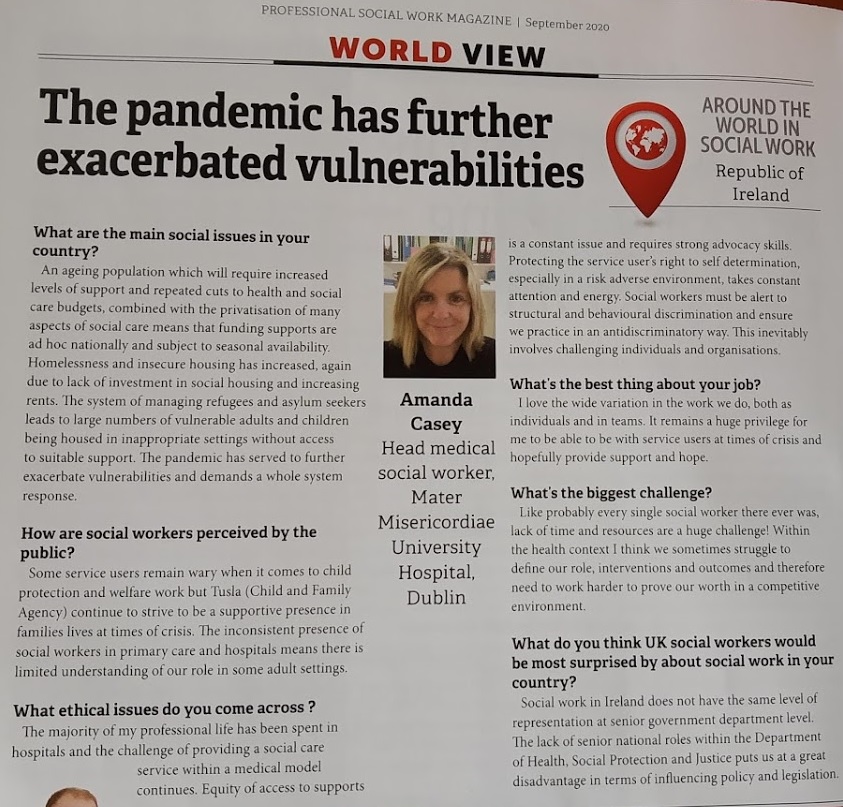 During lockdown, the Irish Association of Social Workers saw that crucial information on how social workers are supported (or are unsupported) to do the work they need to do was missing. To capture this information, hear the worries and concerns of social workers, and explore the experiences of and adaptability of social work in an era of pandemic, we sought and received permission from the British Association of Social Workers (BASW) to replicate and adapt their Social work during Coronavirus (COVID-19) - Ongoing Survey. We also sought and received funding support from the Department of Children and Youth Affairs (DCYA) to conduct the IASW Social Work During Covid-19 Ongoing Survey. You can see more information here: https://www.iasw.ie/IASW_SocialWork_Covid19Survey