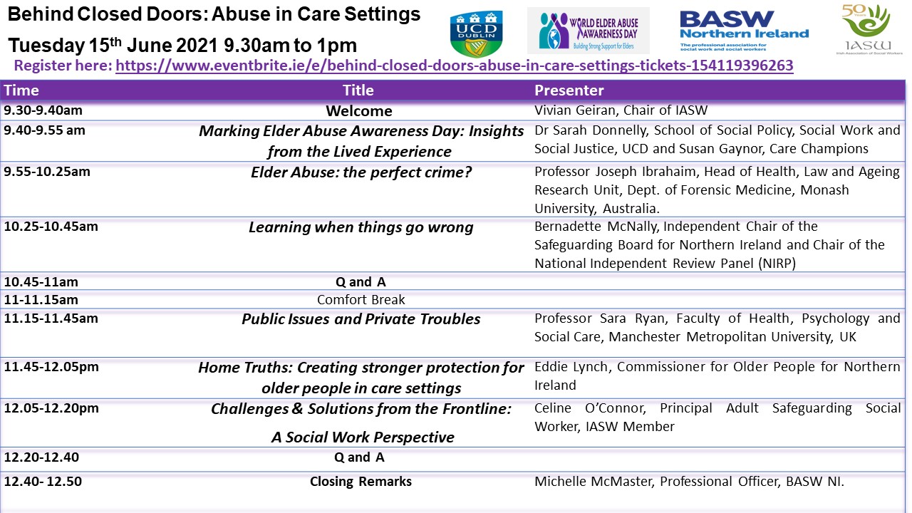The School of Social Policy, Social Work and Social Justice UCD in collaboration with the Irish Association of Social Workers and BASW NI are delighted to co-host a free webinar to mark World Elder Abuse Awareness Day 2021.